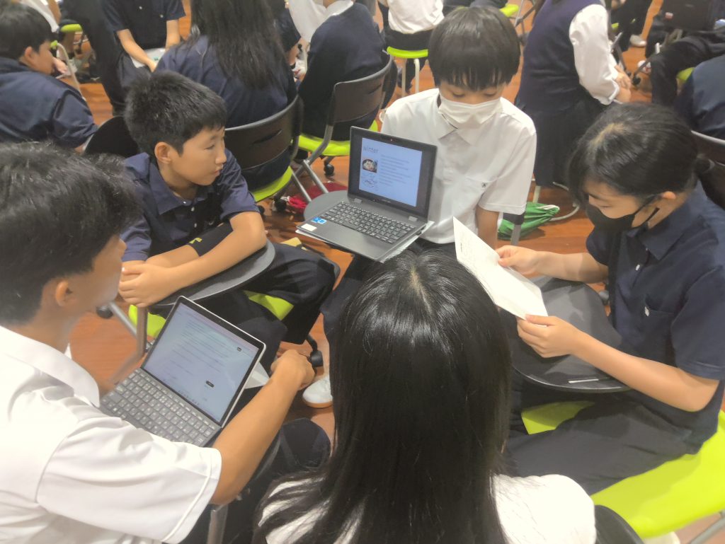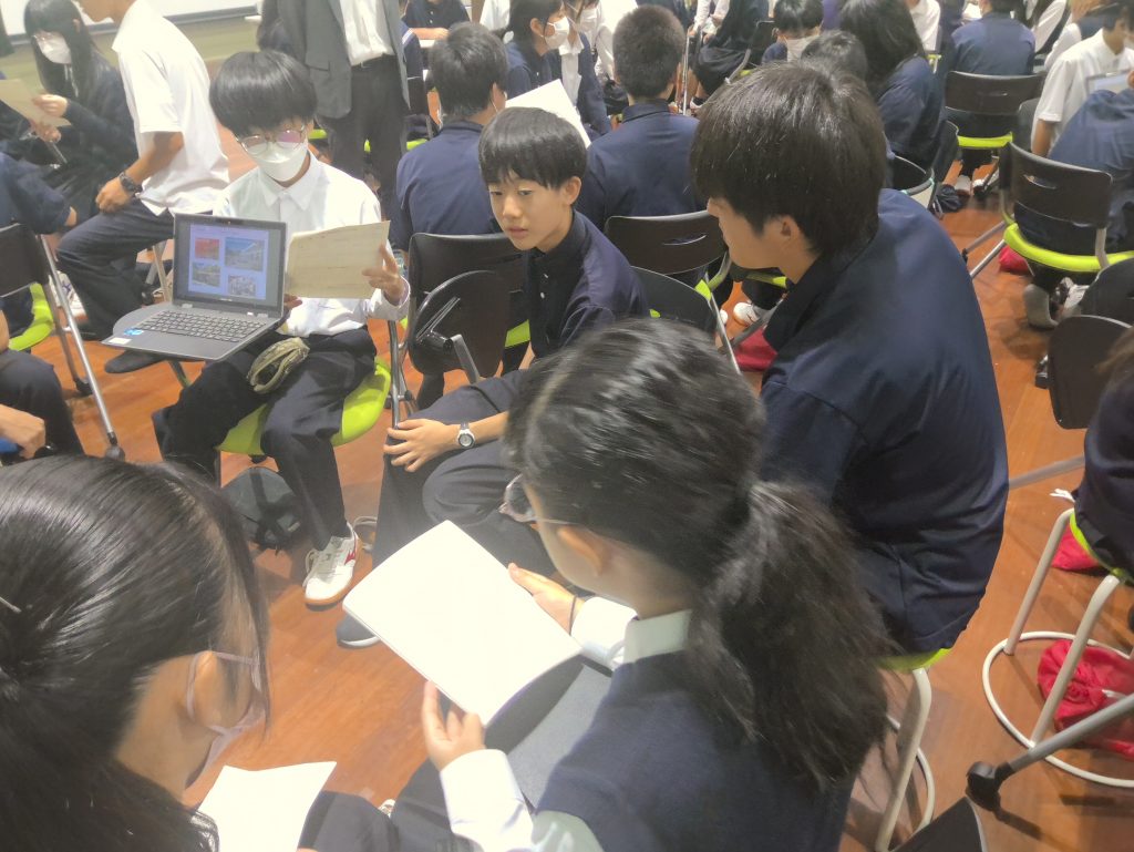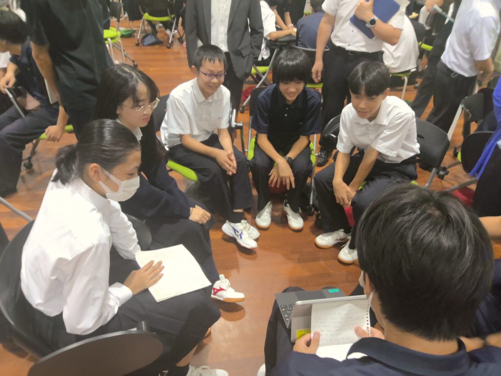 高校2年生と一緒に英語の授業を実施しました。最初は高校生代表によるプレゼンです。オーストラリアでの海外研修で学んだことを英語で発表していました。その後は、グループで中学生が「街紹介」、高校生が「私の好きなもの」を英語で発表し合っていました。