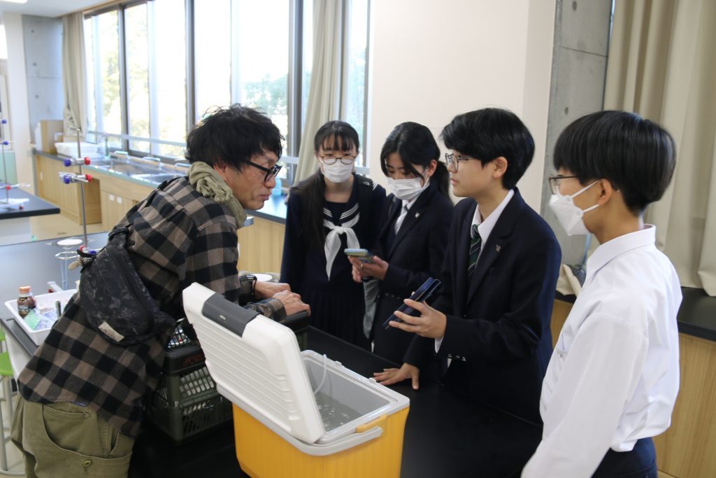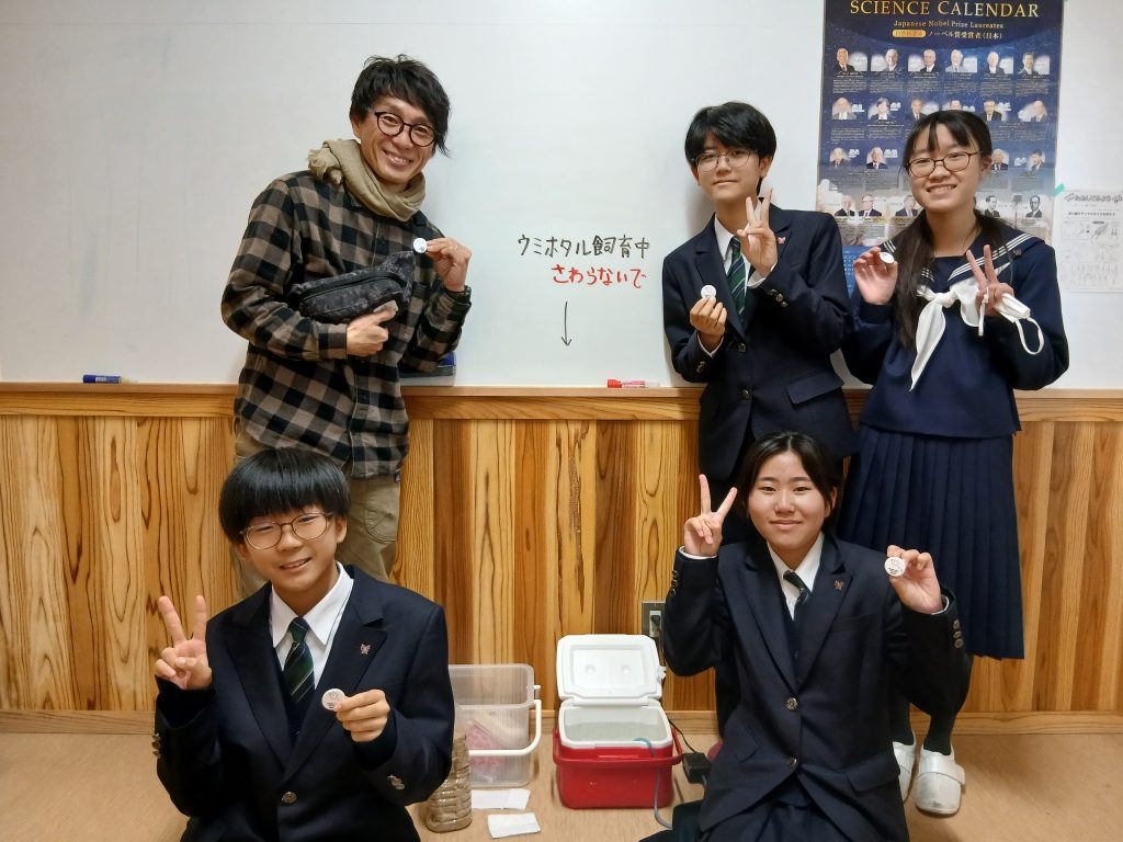 お知らせ/マイプロジェクト ウミホタル探究 2025年11月17日 ウミホタルおじさんこと、辻ミチタカさんが、ウミホタルを探究しているグループに会いに来てくれました。「君たちは誰もやったことのないことをしている。上手くいかないのが当たり前。失敗で落ち込むことは必要ない」とたくさん言葉をかけてくれました。 ウミホタルについてはまだ分かっていないことが多いそうです。ささいなことでも記録を取っておくことの大切さも教えていただきました。