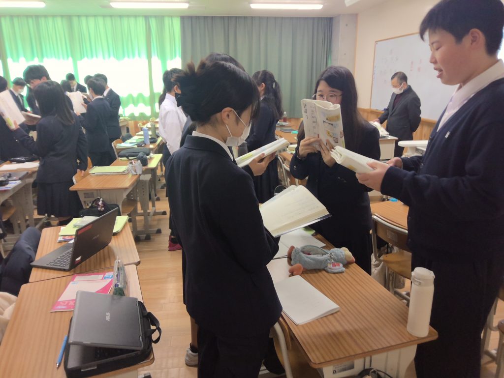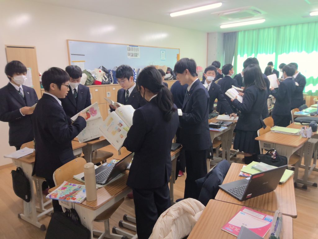 国語では、「竹取物語」の学習を行っています。グループで音読をしながら、古典特有の言葉の響きやリズムを体感しています。
