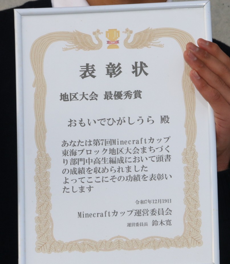 お知らせ 第7回Minecraftカップ地区大会最優秀賞 2026年1月15日 本校生徒が中心メンバーをつとめるチームが、第7回Minecraftカップまちづくり部門において、地区大会最優秀賞を受賞しました。2月15日に全国大会が東京大学にて実施されます。応援よろしくお願いします。 作品はこちらからご覧いただけます。