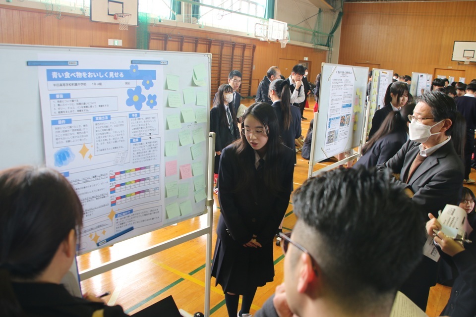 半田高校の合同探究発表会に、中学生も4名がポスターセッションで参加しました。 聴衆を惹きつける独特の難しさに戸惑いつつも、質問に堂々と答える姿が非常に印象的でした。