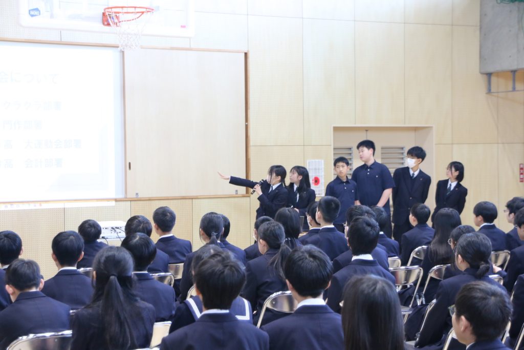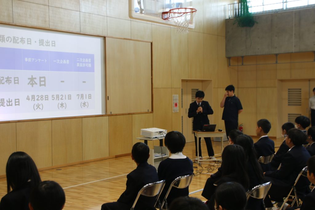 オリエンテーションでは、2年生の担当者から、ひいらぎ祭実行委員会の募集について説明がありました。実行委員にはどのような役割があるのかをわかりやすく伝え、最後には質問に答える時間もありました。